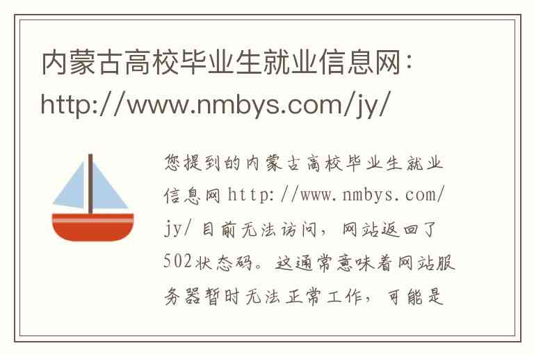 您提到的内蒙古高校毕业生就业信息网 http://www.nmbys.com/jy/ 目前无法访问,网站返回了502状态码。这通常意味着网站服务器暂时无法正常工作,可能是正在维护或出现了临时故障。