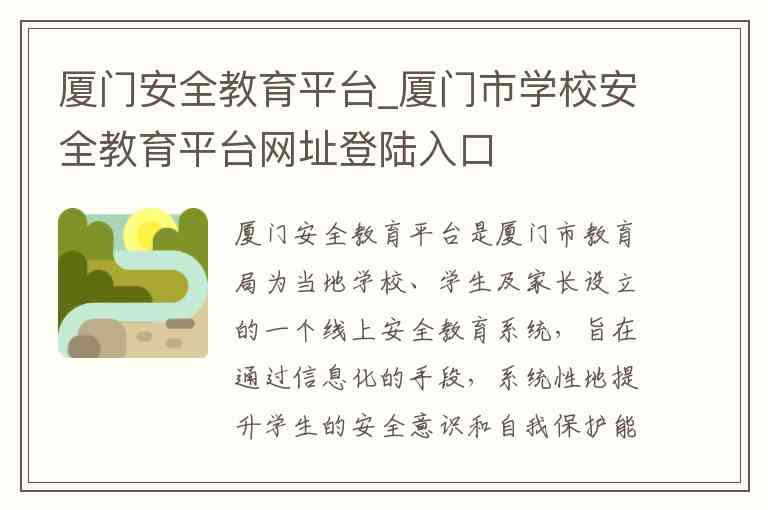 厦门安全教育平台是厦门市教育局为当地学校、学生及家长设立的一个线上安全教育系统,旨在通过信息化的手段,系统性地提升学生的安全意识和自我保护能力 -7-8。以下为你整理的关于该平台的登录入口、主要服务内容以及相关的联系方式。