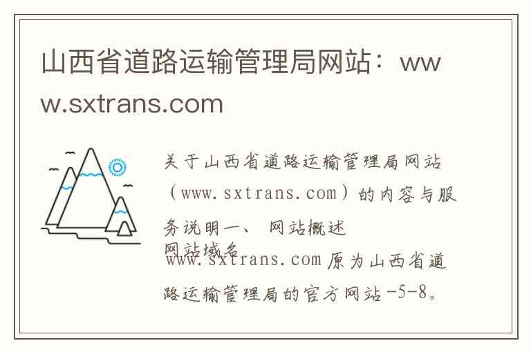网站状态:网站 www.sxtrans.com 的域名虽然在有效期内,但其作为主要门户的功能可能已被整合或替代 -5。如需获取最新的政务信息和服务,建议直接访问山西省交通运输厅的官方网站(jtyst.shanxi.gov.cn)或其主办的其他公众服务平台 -2。