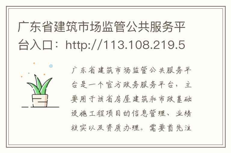 广东省建筑市场监管公共服务平台已经完成了系统升级,并启用了全新的访问地址。根据最新的政府公告,原地址已不再使用,请通过以下新地址进行访问: