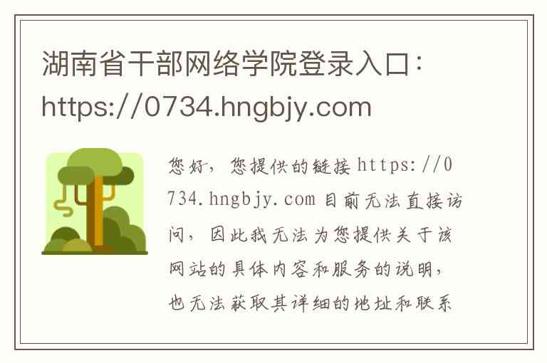 您好,您提供的链接 https://0734.hngbjy.com 目前无法直接访问,因此我无法为您提供关于该网站的具体内容和服务的说明,也无法获取其详细的地址和联系方式。