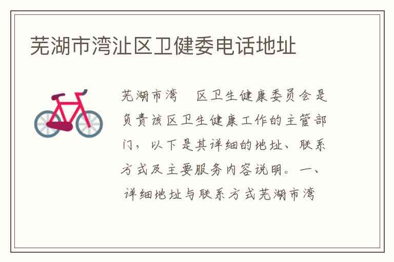 芜湖市湾沚区卫生健康委员会是负责该区卫生健康工作的主管部门,以下是其详细的地址、联系方式及主要服务内容说明。