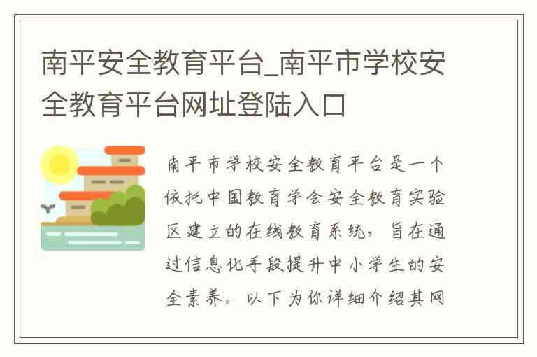 南平市学校安全教育平台是一个依托中国教育学会安全教育实验区建立的在线教育系统,旨在通过信息化手段提升中小学生的安全素养。以下为你详细介绍其网址登陆入口、主要服务内容以及相关联系方式。