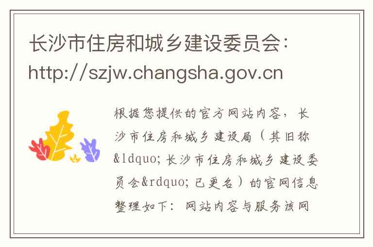 根据您提供的官方网站内容,长沙市住房和城乡建设局(其旧称“长沙市住房和城乡建设委员会”已更名)的官网信息整理如下: