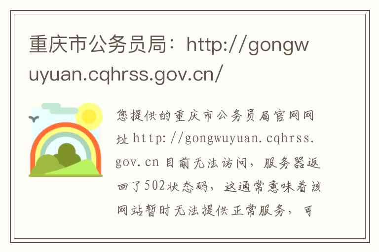 您提供的重庆市公务员局官网网址 http://gongwuyuan.cqhrss.gov.cn 目前无法访问,服务器返回了502状态码,这通常意味着该网站暂时无法提供正常服务,可能已经停用或变更。