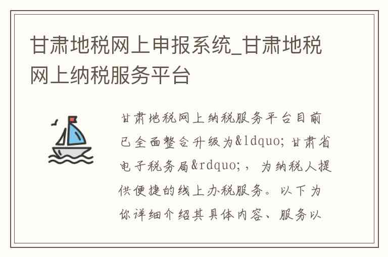 甘肃地税网上纳税服务平台目前已全面整合升级为“甘肃省电子税务局”,为纳税人提供便捷的线上办税服务。以下为你详细介绍其具体内容、服务以及详细的地址和联系方式。