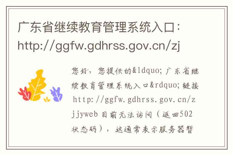 您好,您提供的“广东省继续教育管理系统入口”链接 http://ggfw.gdhrss.gov.cn/zjjyweb 目前无法访问(返回502状态码),这通常表示服务器暂时无法提供该服务。根据搜索到的信息,该系统已经进行了域名变更。以下为您整理的最新官方入口、服务内容及联系方式。