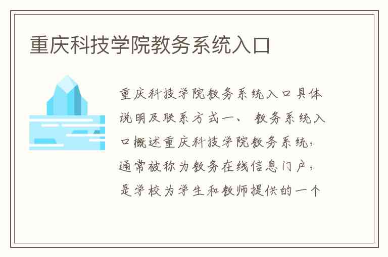 重庆科技学院教务系统,通常被称为教务在线信息门户,是学校为学生和教师提供的一个数字化综合服务平台,主要用于管理与教学相关的各类事务-1。该平台集成了多种功能,旨在帮助用户高效处理学业相关事宜,可以视作学习生活的数字管家-1。