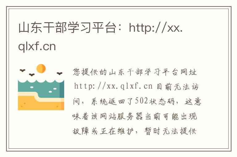 您提供的山东干部学习平台网址 http://xx.qlxf.cn 目前无法访问,系统返回了502状态码,这意味着该网站服务器当前可能出现故障或正在维护,暂时无法提供服务。