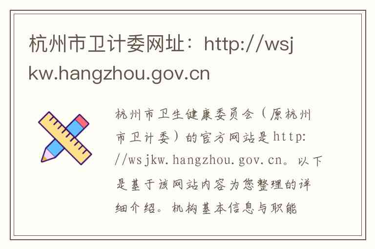杭州市卫生健康委员会(原杭州市卫计委)的官方网站是 http://wsjkw.hangzhou.gov.cn。以下是基于该网站内容为您整理的详细介绍。