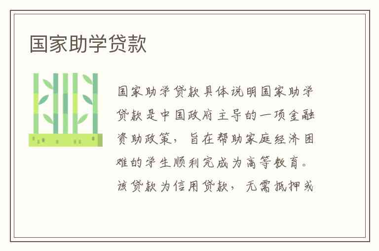 国家助学贷款是中国政府主导的一项金融资助政策,旨在帮助家庭经济困难的学生顺利完成为高等教育。该贷款为信用贷款,无需抵押或担保,学生在校期间无需支付利息,由财政全额补贴。