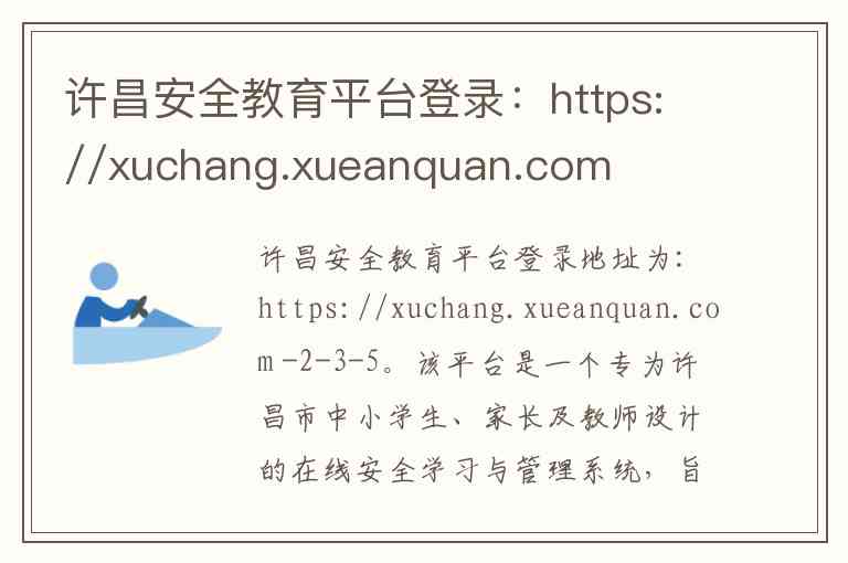 许昌安全教育平台登录地址为:https://xuchang.xueanquan.com -2-3-5。该平台是一个专为许昌市中小学生、家长及教师设计的在线安全学习与管理系统,旨在通过信息化手段提升学生的安全意识和自我保护能力 -3-6。
