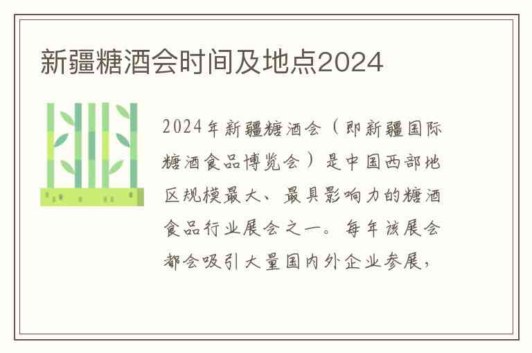 2024年新疆糖酒会(即新疆国际糖酒食品博览会)是中国西部地区规模最大、最具影响力的糖酒食品行业展会之一。每年该展会都会吸引大量国内外企业参展,涵盖食品、饮料、酒类、调味品等多个行业领域。具体的时间和地点会由主办方发布,通常会提前在展会官方网站和媒体上进行公告。