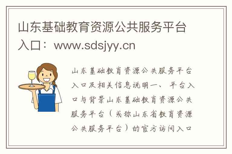 山东基础教育资源公共服务平台(或称山东省教育资源公共服务平台)的官方访问入口网站地址为:www.sdsjyy.cn -4。该平台是山东省教育信息化建设的重要组成部分,由山东省教育厅主导规划,旨在利用数字化手段赋能全省基础教育,促进教育优质均衡发展 -1-5。在后续的发展中,该平台也融入了更广泛的“山东省教育公共服务平台(鲁教云)”体系,作为其重要的支撑 -1-10。
