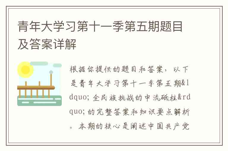 本期核心精神总结 本期青年大学习通过以上题目,系统回顾了中国共产党在抗日战争中的伟大历史贡献。历史雄辩地证明:中国共产党是全民族抗战的中流砥柱。