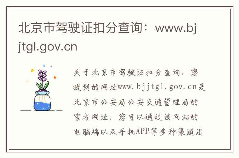 关于北京市驾驶证扣分查询,您提到的网址www.bjjtgl.gov.cn是北京市公安局公安交通管理局的官方网址。您可以通过该网站的电脑端以及手机APP等多种渠道进行查询。以下是具体的查询方法、服务内容以及详细的官方地址和联系方式。