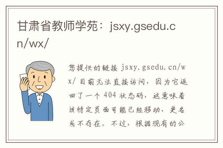 您提供的链接 jsxy.gsedu.cn/wx/ 目前无法直接访问,因为它返回了一个 404 状态码,这意味着该特定页面可能已经移动、更名或不存在。不过,根据现有的公开信息,我为您整理了关于“甘肃教师学苑”的详细说明,包括其内容服务、地址及联系方式。