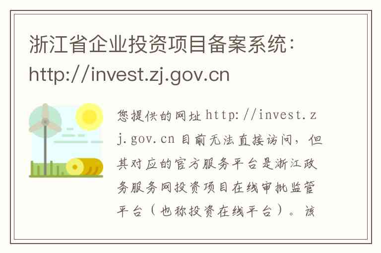 您提供的网址 http://invest.zj.gov.cn 目前无法直接访问,但其对应的官方服务平台是浙江政务服务网投资项目在线审批监管平台(也称投资在线平台)。该平台是浙江省企业办理投资项目备案及相关审批事项的全省统一、唯一在线入口-7。以下将根据公开信息,为您详细介绍其内容与服务,并提供相关地址和联系方式。