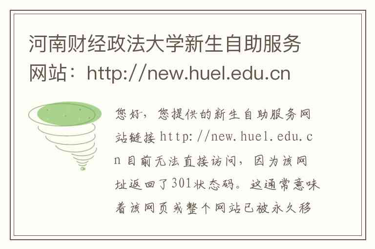 您好,您提供的新生自助服务网站链接 http://new.huel.edu.cn 目前无法直接访问,因为该网址返回了301状态码。这通常意味着该网页或整个网站已被永久移动到了一个新的网络地址,访问请求被自动重定向,但无法从当前链接直接获取到内容。