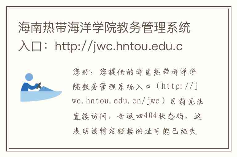您好,您提供的海南热带海洋学院教务管理系统入口(http://jwc.hntou.edu.cn/jwc)目前无法直接访问,会返回404状态码,这表明该特定链接地址可能已经失效或更名。不过,您可以通过以下更可靠的方式访问并使用学校的教务管理系统,以下是详细说明。