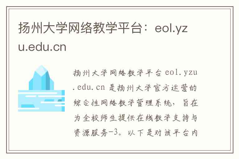 扬州大学网络教学平台 eol.yzu.edu.cn 是扬州大学官方运营的综合性网络教学管理系统,旨在为全校师生提供在线教学支持与资源服务-3。以下是对该平台内容、服务的具体说明及相关联系方式。