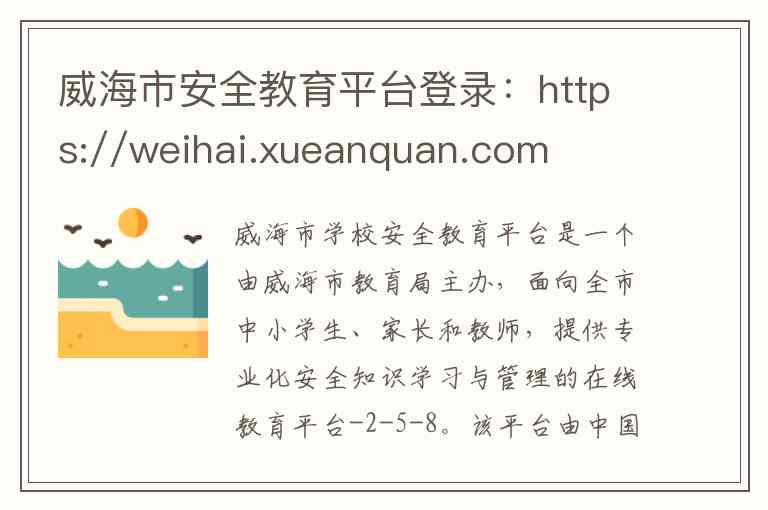 威海市学校安全教育平台是一个由威海市教育局主办,面向全市中小学生、家长和教师,提供专业化安全知识学习与管理的在线教育平台-2-5-8。该平台由中国教育学会提供学术支持,旨在通过系统的课程与活动,提升学生的安全防范意识和自我保护能力-2-5。