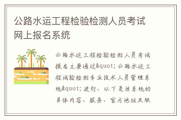 公路水运工程检验检测人员考试报名主要通过"公路水运工程试验检测专业技术人员管理系统"进行,以下是该系统的具体内容、服务、官方地址及联系方式。
