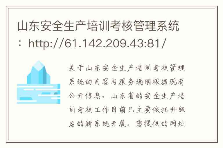 根据现有公开信息,山东省的安全生产培训考核工作目前已主要依托升级后的新系统开展。您提供的网址http://61.142.209.43:81/ 是一个具体的IP地址加端口号,通常用于直接访问特定的管理后台或特定时期的系统入口。但在最新的官方通告中,主要面向公众和考生的统一入口及系统名称已发生变化。