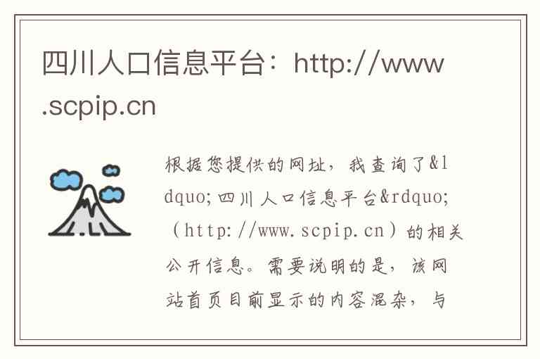 根据您提供的网址,我查询了“四川人口信息平台”(http://www.scpip.cn)的相关公开信息。需要说明的是,该网站首页目前显示的内容混杂,与您询问的“人口信息平台”无直接关联。以下内容综合了该平台的历史介绍和相关政府公开信息,供您参考。