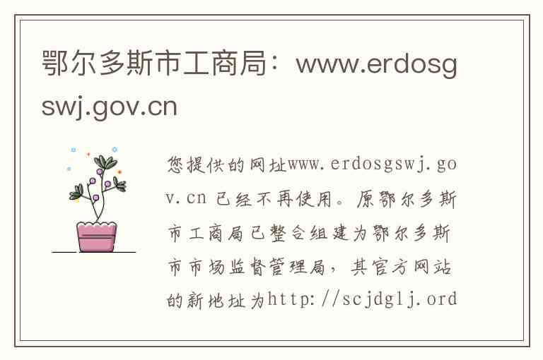 您提供的网址www.erdosgswj.gov.cn 已经不再使用。原鄂尔多斯市工商局已整合组建为鄂尔多斯市市场监督管理局,其官方网站的新地址为http://scjdglj.ordos.gov.cn/ -2-3-5。以下为您详细说明该局(新官网)的内容、服务以及联系方式。