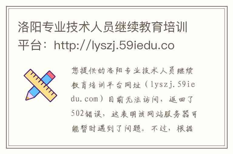 您提供的洛阳专业技术人员继续教育培训平台网址(lyszj.59iedu.com)目前无法访问,返回了502错误,这表明该网站服务器可能暂时遇到了问题。不过,根据洛阳市人力资源和社会保障局发布的官方通知及相关信息,为您整理了关于洛阳市专业技术人员继续教育的内容与服务详情,以及更可靠的学习平台与联系方式。