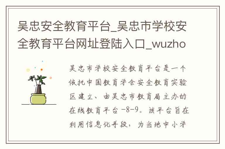 吴忠市学校安全教育平台是一个依托中国教育学会安全教育实验区建立、由吴忠市教育局主办的在线教育平台 -8-9。该平台旨在利用信息化手段,为当地中小学生、家长及教师提供系统化的安全知识学习与管理系统 -3-4-6。