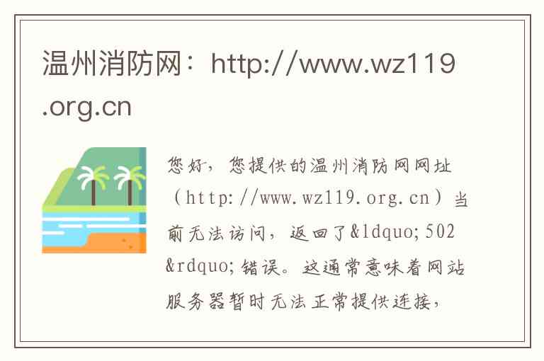 您好,您提供的温州消防网网址(http://www.wz119.org.cn)当前无法访问,返回了“502”错误。这通常意味着网站服务器暂时无法正常提供连接,可能是由于网站维护、服务器过载或网络问题导致的暂时性故障。