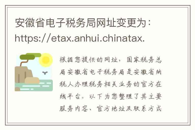 根据您提供的网址,国家税务总局安徽省电子税务局是安徽省纳税人办理税务相关业务的官方在线平台。以下为您整理了其主要服务内容、官方地址及联系方式。
