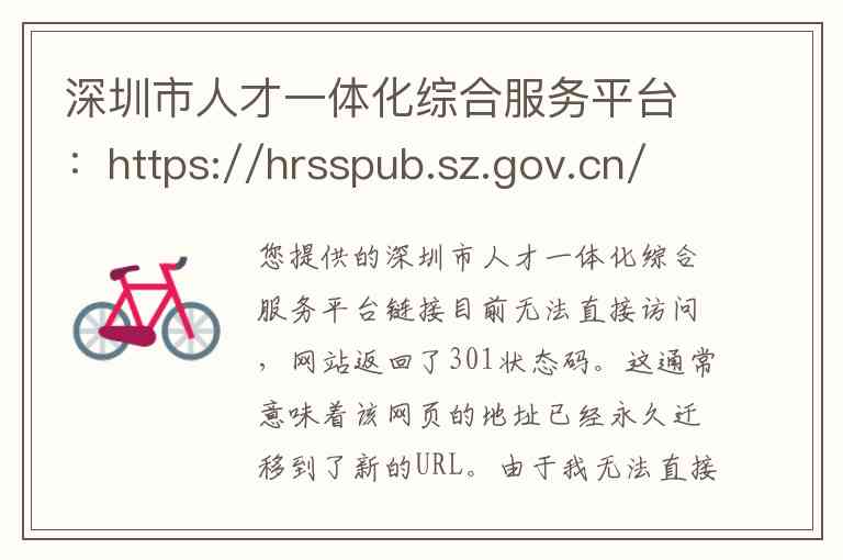 您提供的深圳市人才一体化综合服务平台链接目前无法直接访问,网站返回了301状态码。这通常意味着该网页的地址已经永久迁移到了新的URL。