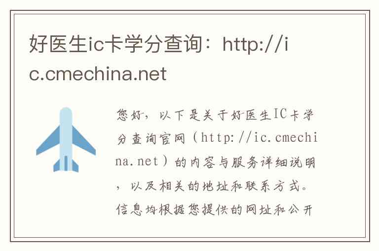 您好,以下是关于好医生IC卡学分查询官网(http://ic.cmechina.net)的内容与服务详细说明,以及相关的地址和联系方式。信息均根据您提供的网址和公开的官方通知整理,以纯文字形式呈现,未使用特殊符号。