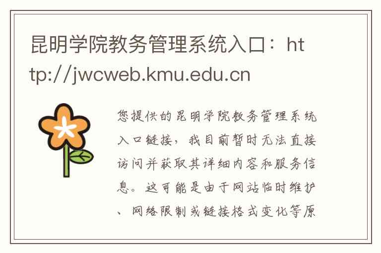 您提供的昆明学院教务管理系统入口链接,我目前暂时无法直接访问并获取其详细内容和服务信息。这可能是由于网站临时维护、网络限制或链接格式变化等原因造成的。