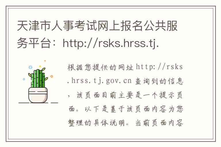 根据您提供的网址 http://rsks.hrss.tj.gov.cn 查询到的信息,该页面目前主要是一个提示页面。以下是基于该页面内容为您整理的具体说明。