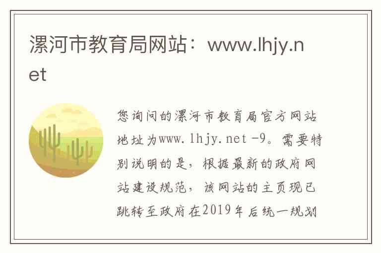 您询问的漯河市教育局官方网站地址为www.lhjy.net -9。需要特别说明的是,根据最新的政府网站建设规范,该网站的主页现已跳转至政府在2019年后统一规划的域名 jyj.luohe.gov.cn -1-3-5。以下是关于该网站内容、服务及联系方式的详细说明。