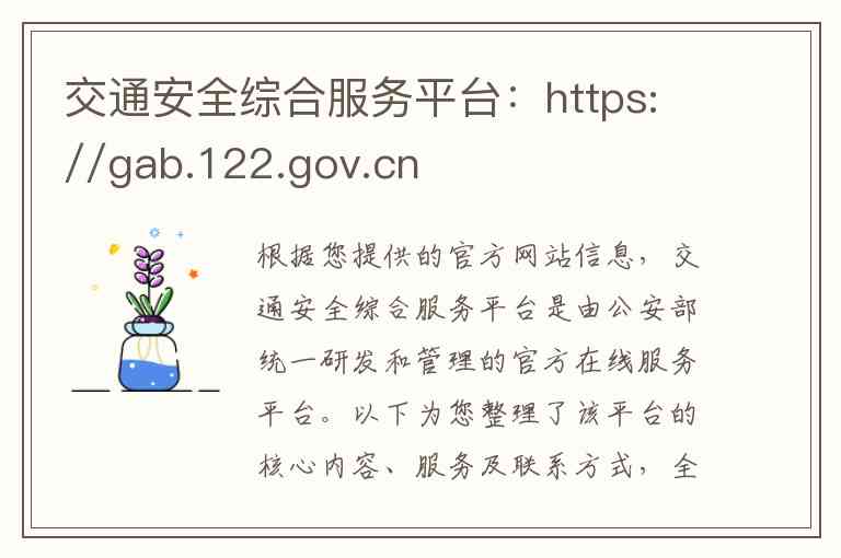 根据您提供的官方网站信息,交通安全综合服务平台是由公安部统一研发和管理的官方在线服务平台。以下为您整理了该平台的核心内容、服务及联系方式,全部以纯文字形式呈现。