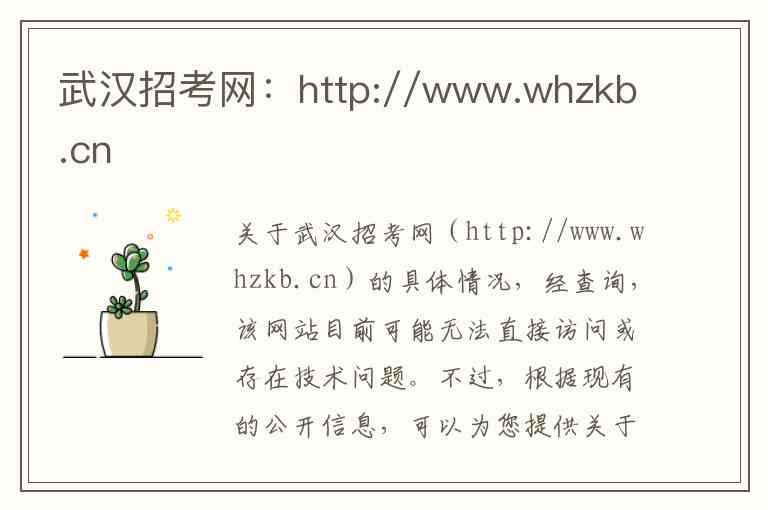 关于武汉招考网(http://www.whzkb.cn)的具体情况,经查询,该网站目前可能无法直接访问或存在技术问题。不过,根据现有的公开信息,可以为您提供关于该网站的详细说明,包括其主办单位、主要服务内容以及其他相关的官方联系方式。