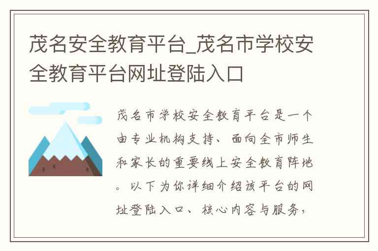 茂名市学校安全教育平台是一个由专业机构支持、面向全市师生和家长的重要线上安全教育阵地。以下为你详细介绍该平台的网址登陆入口、核心内容与服务,以及相关的联系方式。