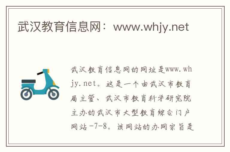 武汉教育信息网的网址是www.whjy.net。这是一个由武汉市教育局主管、武汉市教育科学研究院主办的武汉市大型教育综合门户网站 -7-8。该网站的办网宗旨是服务于武汉教育的改革与发展、学校教学与科研、教师与学生的工作学习、教育行政与依法治教以及社会公众对教育的需求 -7-8。网站的具体内容和服务由武汉市教育科学研究院现代教育技术中心负责设计、开发与管理 -7-8。