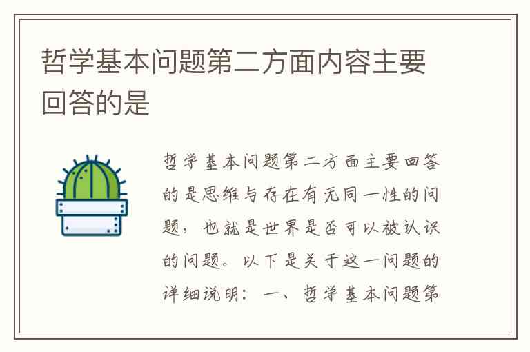 哲学基本问题第二方面主要回答的是思维与存在有无同一性的问题,也就是世界是否可以被认识的问题。以下是关于这一问题的详细说明: