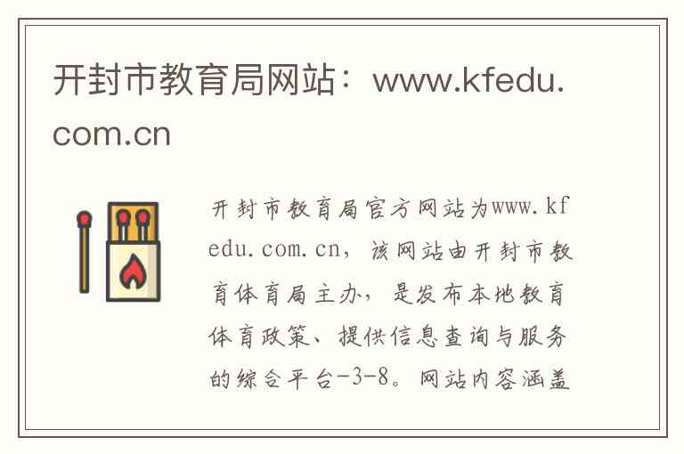 开封市教育局官方网站为www.kfedu.com.cn,该网站由开封市教育体育局主办,是发布本地教育体育政策、提供信息查询与服务的综合平台-3-8。网站内容涵盖机构概况、信息公开、便民服务等多个方面,以下为您详细介绍其内容与服务,并提供详细的地址和联系方式。