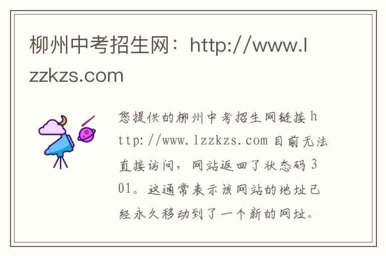 您提供的柳州中考招生网链接 http://www.lzzkzs.com 目前无法直接访问,网站返回了状态码 301。这通常表示该网站的地址已经永久移动到了一个新的网址。