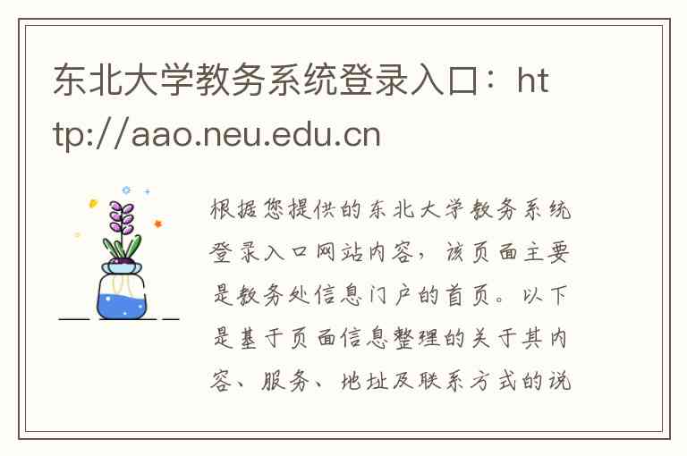 根据您提供的东北大学教务系统登录入口网站内容,该页面主要是教务处信息门户的首页。以下是基于页面信息整理的关于其内容、服务、地址及联系方式的说明。