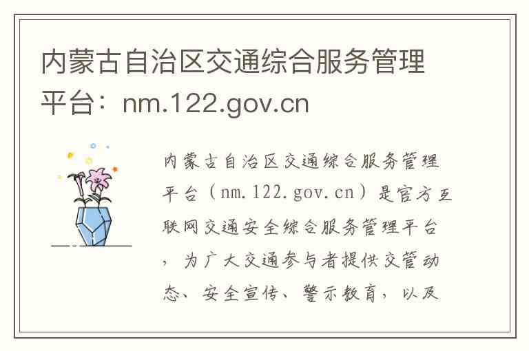 内蒙古自治区交通综合服务管理平台(nm.122.gov.cn)是官方互联网交通安全综合服务管理平台,为广大交通参与者提供交管动态、安全宣传、警示教育,以及交通管理信息查询、告知、业务预约受理办理等便民利民服务-1。该平台由内蒙古自治区公安厅交通管理局主办-5,旨在让群众足不出户享受互联网加交通管理创新带来的高效便捷服务-2。