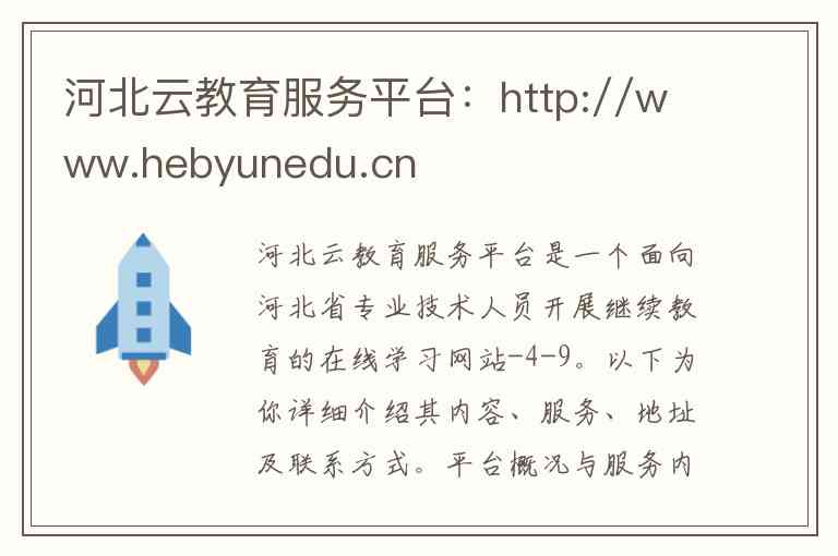 河北云教育服务平台是一个面向河北省专业技术人员开展继续教育的在线学习网站-4-9。以下为你详细介绍其内容、服务、地址及联系方式。