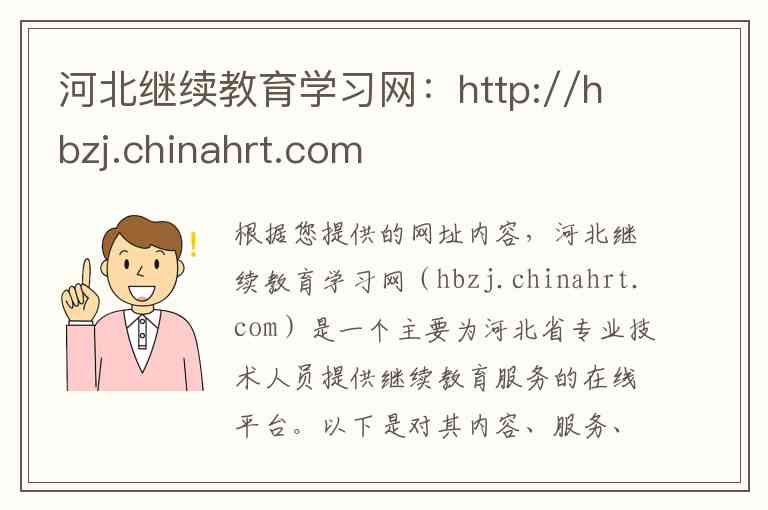 根据您提供的网址内容,河北继续教育学习网(hbzj.chinahrt.com)是一个主要为河北省专业技术人员提供继续教育服务的在线平台。以下是对其内容、服务、地址和联系方式的详细说明。